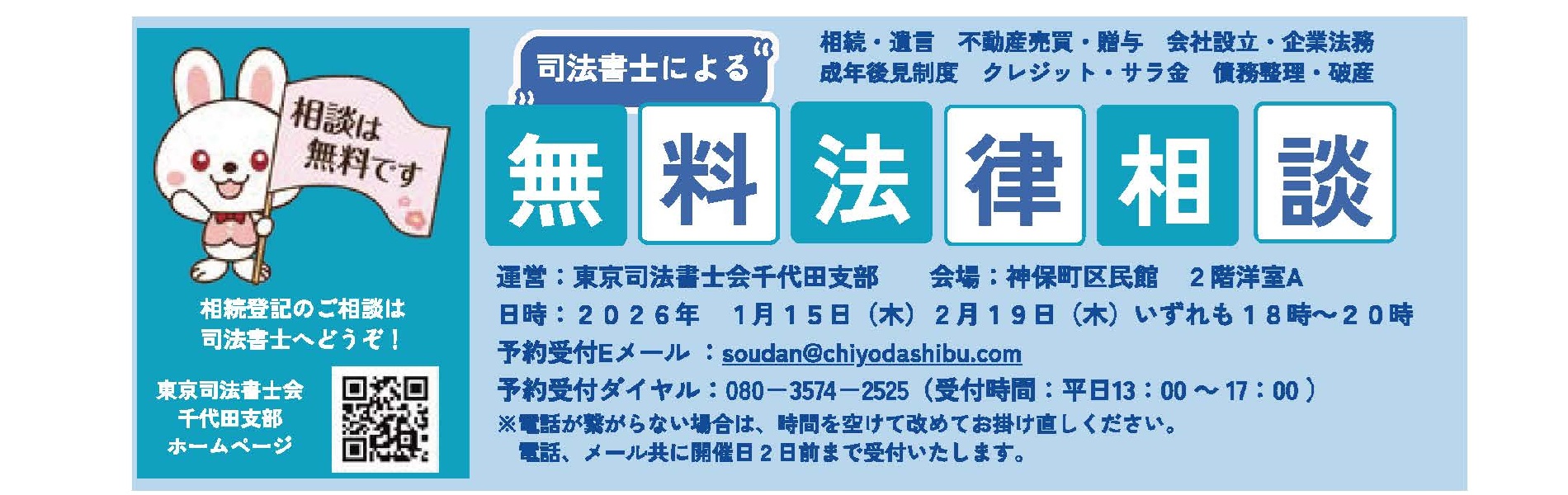 2026年1月19日 / 最終更新日時 : 2026年1月19日 chiyodashibu1 相談会 区民館相談会の開催(2026.2.19) 2026年2月19日(木曜日)18時から20時まで、神保町区民館(ひまわり館) において、相談会を開催いたします。 詳しくは、区民館相談会のページをご覧ください。